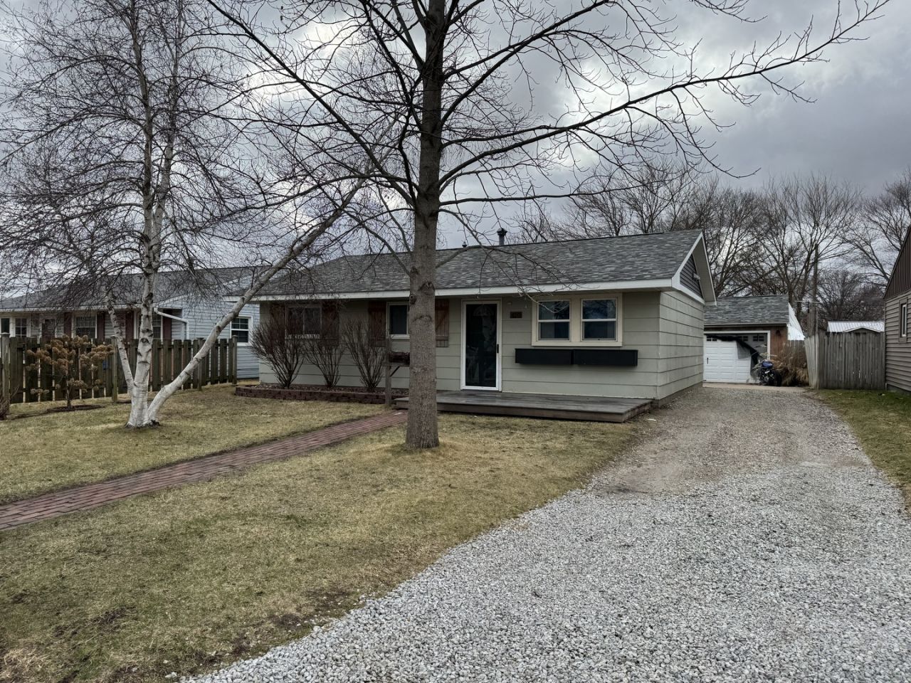 Well-maintained 3-bedroom ranch with convenient slab construction and main-level living. The home features an updated kitchen with abundant cabinetry and storage, perfect for everyday living and entertaining. The remodeled bathroom boasts a 9-foot ceiling, extra storage, and a modern Bluetooth fixture for added comfort and enjoyment. Step outside to your fully fenced backyard oasis, complete with a deck, patio, fire pit, and storage shed-ideal for relaxing evenings or entertaining guests. The oversized 21/2-car garage offers incredible functionality with a drive-through rear garage door leading to the backyard, a built-in bar area, 220V power, and R38 insulation, making it perfect for hobbies, projects, or entertaining year-round. This home combines comfort, functionality, and outdoor enjoyment all in one! Roof 2018 and H20 new in 2025. Owner is leaving siding materials behind the garage for the next owner to install. (complete materials to side the entire house, garage not included)